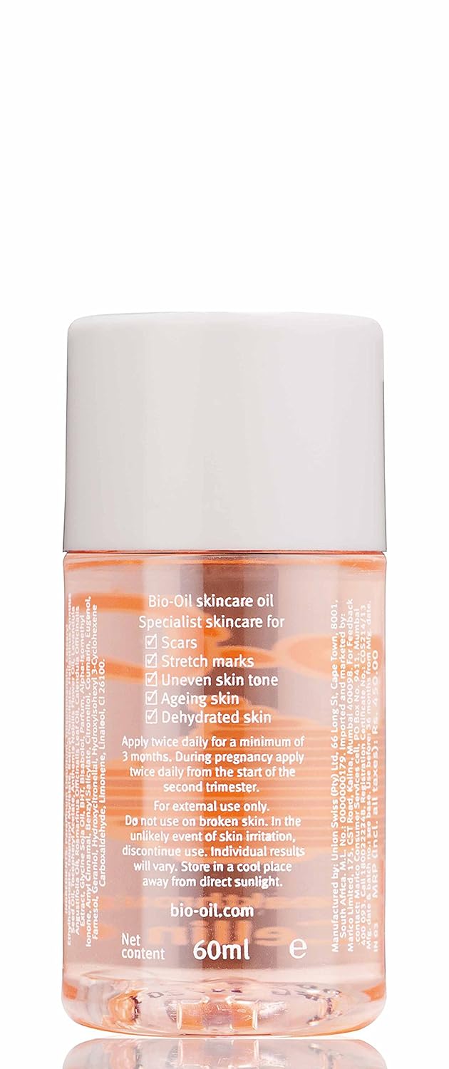 Looking for a treatment for your scars, stretch marks and uneven skin tone? Look no more. Buy the Bio-Oil, 60ml online from Amazon India. This specialist skincare oil reduces stretch marks that are formed during pregnancy, teenage growth spurts and rapid weight gain. It is also effective for ageing and dehydrated skin. The oil contains Vitamin E, Vitamin A, Lavender oil, Calendula oil, Chamomile oil, Rosemary oil and the breakthrough ingredient PurCellin Oil, thus, giving you beautiful healthy looking skin.