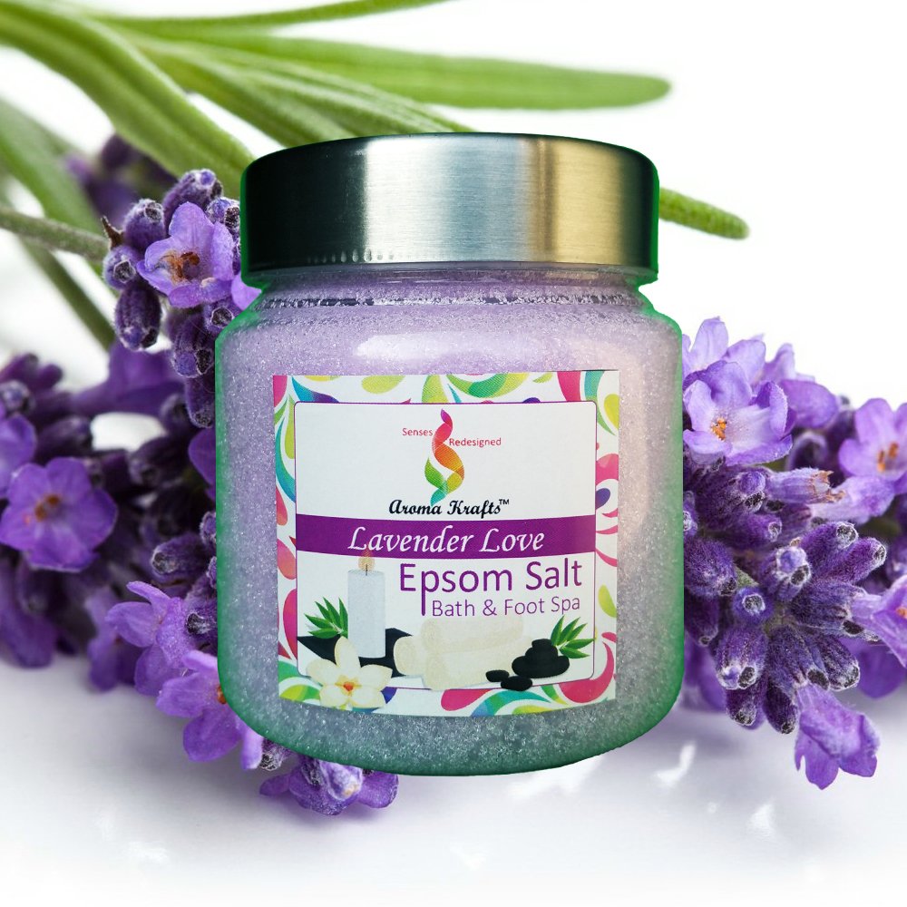 Rejuvenate Yourself and Create Special Spa experience at home. Soak in Ultra Pure Epsom salt. Combined with natural and aromatic ingredients, it creates a magical blend of aromatherapy along with herbal healing. This therapy helps relax tired / sore muscles and scales off the dead skin while pampering your feet / body. For a lavish and luxurious environment also diffuse our specially crafted Aromakrafts Lavender Love Aroma oil along with.